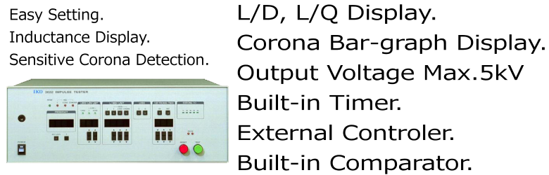This tester is adapted to test all sorts of coils such as various transformers, choke transformers and solenoids. In this tester, we got rid of the concept of waveform-measuring which has been used in conventional impulse testers, realized general tests with electric fundamental quantity by calculating of inductance and loss which are the most fundamental physical quantity of coil. This is an unprecedented new measuring method as it were a transient response type Q meter because it calculates inductance. This tester adopts innovative detecting method of corona components (patented) and displays the results as a bar graph. Thus, this tester can accurately test withstanding voltage of a coil.As this is an unprecedented high power inductance tester, this tester can provide new testing criteria for power which could not be realized by conventional testers, such as testing characteristics of a coil in saturated range.This tester can be put in an IKD's general testing equipment, and provide overall examination of a series of testing items such as withstanding voltage, insulation resistance and DC resistance.